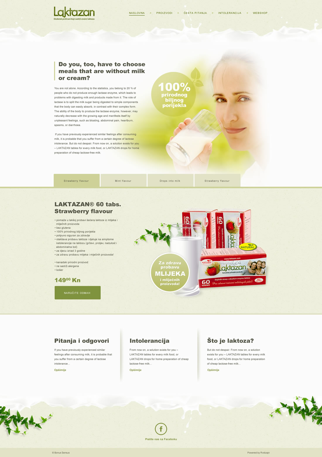 Jednostavni vizualni dizajn za Laktazan proizvod dodatku prehrani, sa vizualnim asocijacijama na prirodne sastojke proizvoda i nadomjestak mlijeku u prehrani.